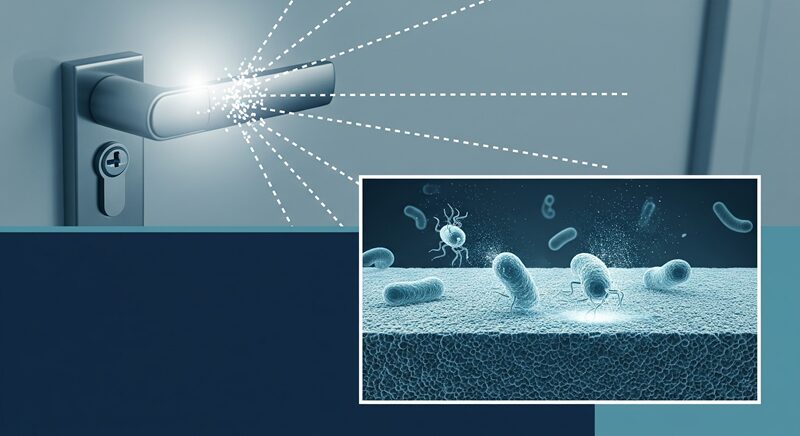 Zamiast cykli „czysto–brudno”, system utrzymuje stabilną, niską równowagę mikrobiologiczną na powierzchniach dotykowych.